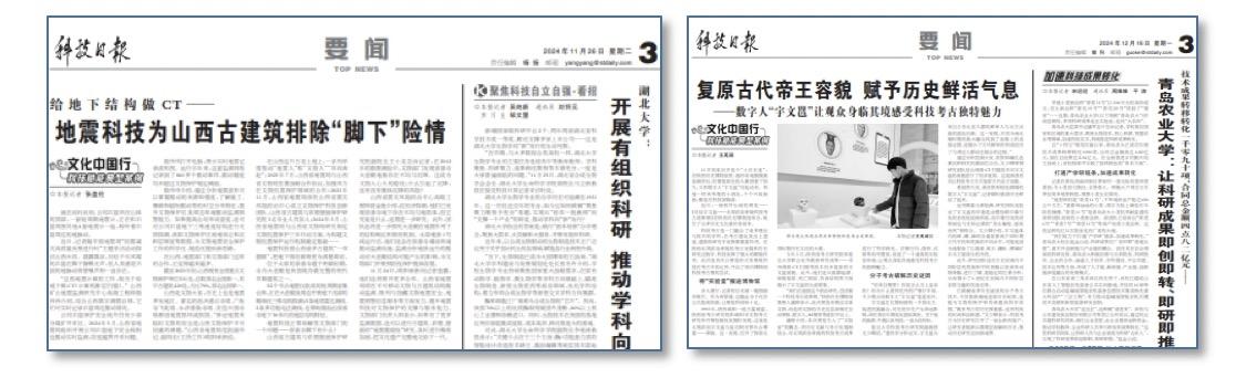 推出“文化中國行·科技賦能典型案例”系列報道,策劃推出《復原古代帝王容貌 賦予歷史鮮活氣息》《5G為北京中軸線注入“活的靈魂”》《給地下結構做CT 地震科技“借”文物保護“一雙慧眼”》等報道,聚焦科技賦能文化遺產保護傳承,講好中華優秀傳統文化故事。持續做好“科技文明探源”專欄,專欄獲第34屆中國新聞獎系列報道三等獎。