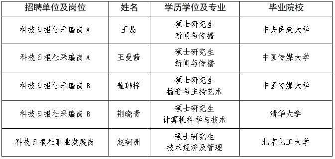 目前,尚有采編崗B(1人)、行政管理崗(1人)正在進行體檢考察,尚未完成招聘程序,將另行公示。