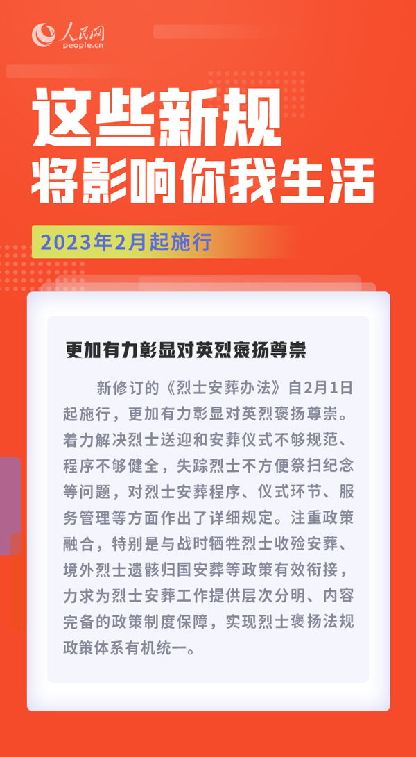 更加有力彰顯對英烈褒揚尊崇;不得違反規定限制證券投資者轉戶、銷戶;規范銀行保險監管統計行為……2月起,這些新規施行,將影響你我生活。