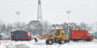 1月22日,湖南長沙,鏟車在長張高速長沙西收費站清理積雪。新華社記者 陳振海 攝