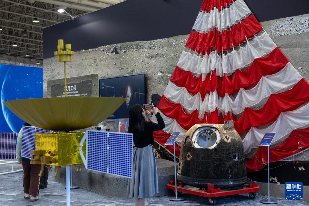 4月23日,參觀者在科普展區拍攝嫦娥五號返回艙用主降落傘等實物展品。新華社記者 胡競文 攝