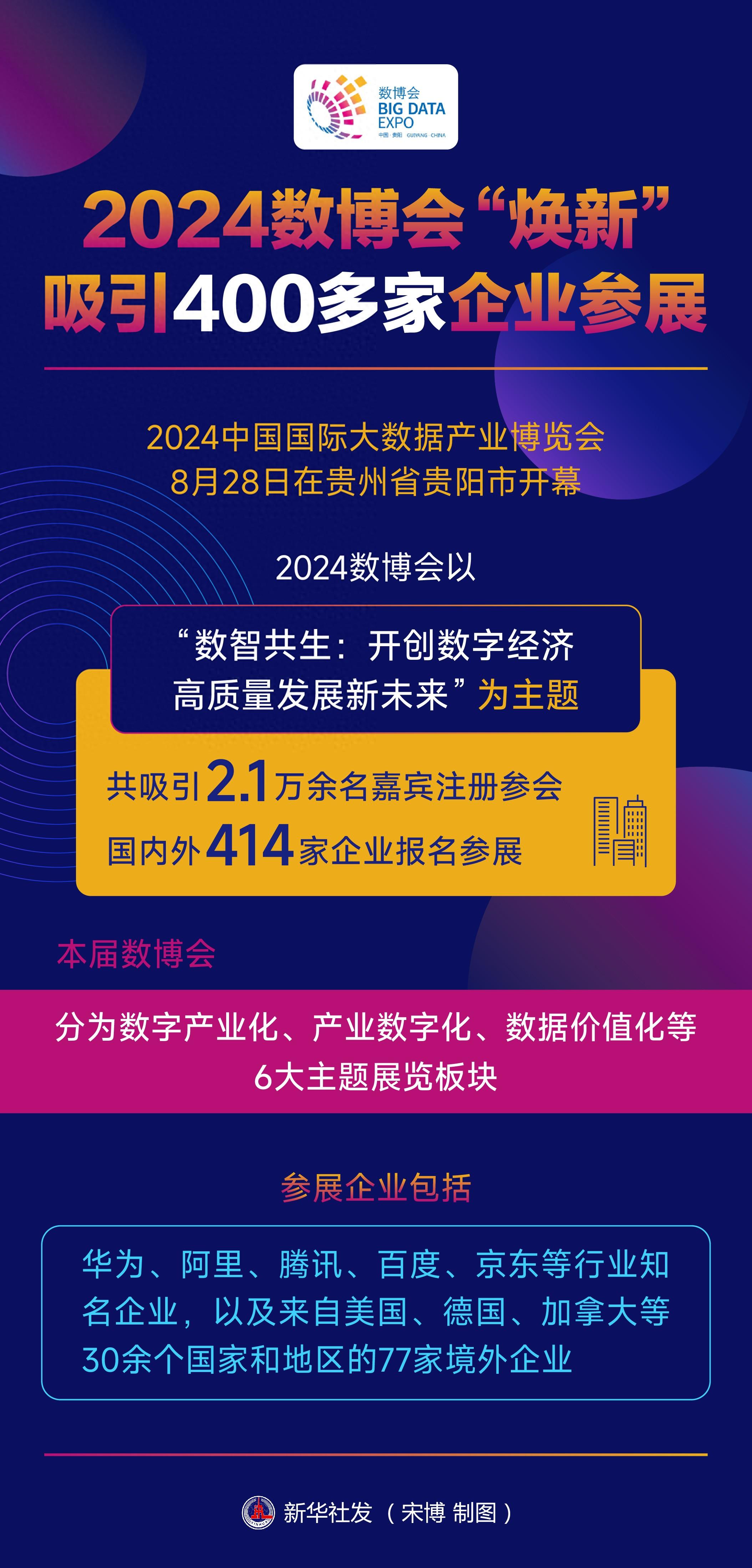 本屆數博會首次由國家數據局主辦,貴州省人民政府承辦,共吸引2.1萬余名嘉賓注冊參會,國內外414家企業報名參展。國家數據局局長劉烈宏在開幕式上說:“歷經十年發展,數博會已經成為我國數據領域引領創新趨勢、展示行業成果、促進開放合作的重要載體。”