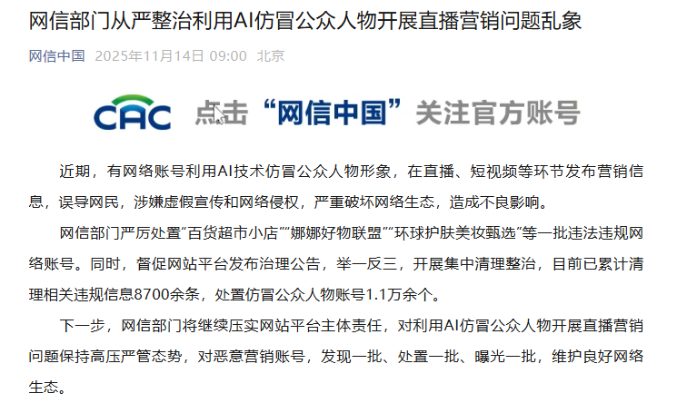 下一步,網信部門將繼續壓實網站平臺主體責任,對利用AI仿冒公眾人物開展直播營銷問題保持高壓嚴管態勢,對惡意營銷賬號,發現一批、處置一批、曝光一批,維護良好網絡生態。