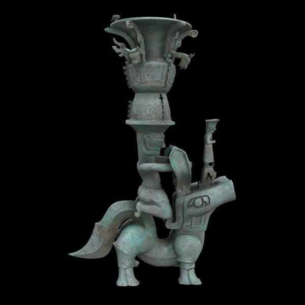 融合了大象、犀牛、虎豹、鳥雀等意象,一座“四不像”神獸巍然挺立。神獸背上,祭祀者頭頂華美銅尊跪坐,再現了古蜀國祭祀的場景。近日,記者走進四川廣漢三星堆博物館,見到了這尊通高1.589米的“銅獸馱跪坐人頂尊銅像”。